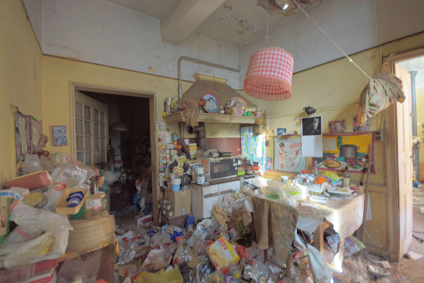 constate que les choses sont plus belles qu'il n'y parait. Nous arpentons le petit couloir qui nous sépare des pièces à vivre. Il est parsemé de bouteilles vides et de pots de yaourts. Sur notre droite, une grande pièce qui faisait office de cuisine et de salle de bains, et tout droit, un premier salon à la décoration assez singulière. On trouve