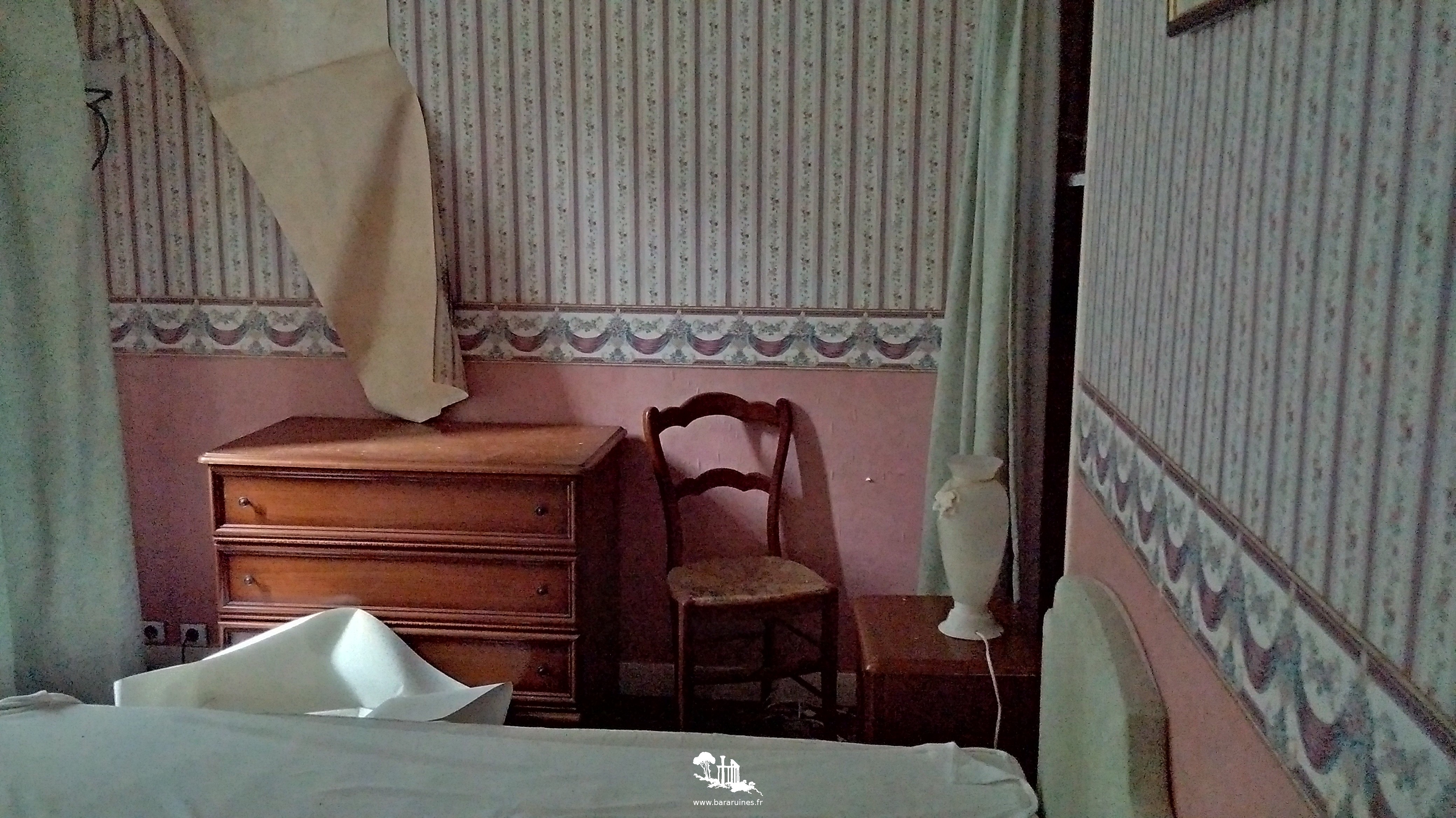 bar et un sauna. Nous rentrons alors dans une ancienne salle de repas qui semble prête à accueillir de nouveaux clients. Sur une table, un mot indique aux visiteurs de respecter le lieu. Nous passons par la cuisine, totalement équipée et par un autre petit salon, dans le noir, où des gens ont visiblement pris l'apéro dernièrement. Celui-ci possède d'ailleurs un magnifique meuble rempli de verres à vin et de coupes à champagne. La chambre de ce rez-de-chaussée est de toute beauté et a sans aucun doute servi de mise en scène à de récents photographes. C'est dingue. Tout est tellement propre, qu'on a vraiment l'impression de faire une visite immobilière ! Nous