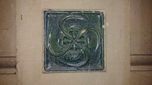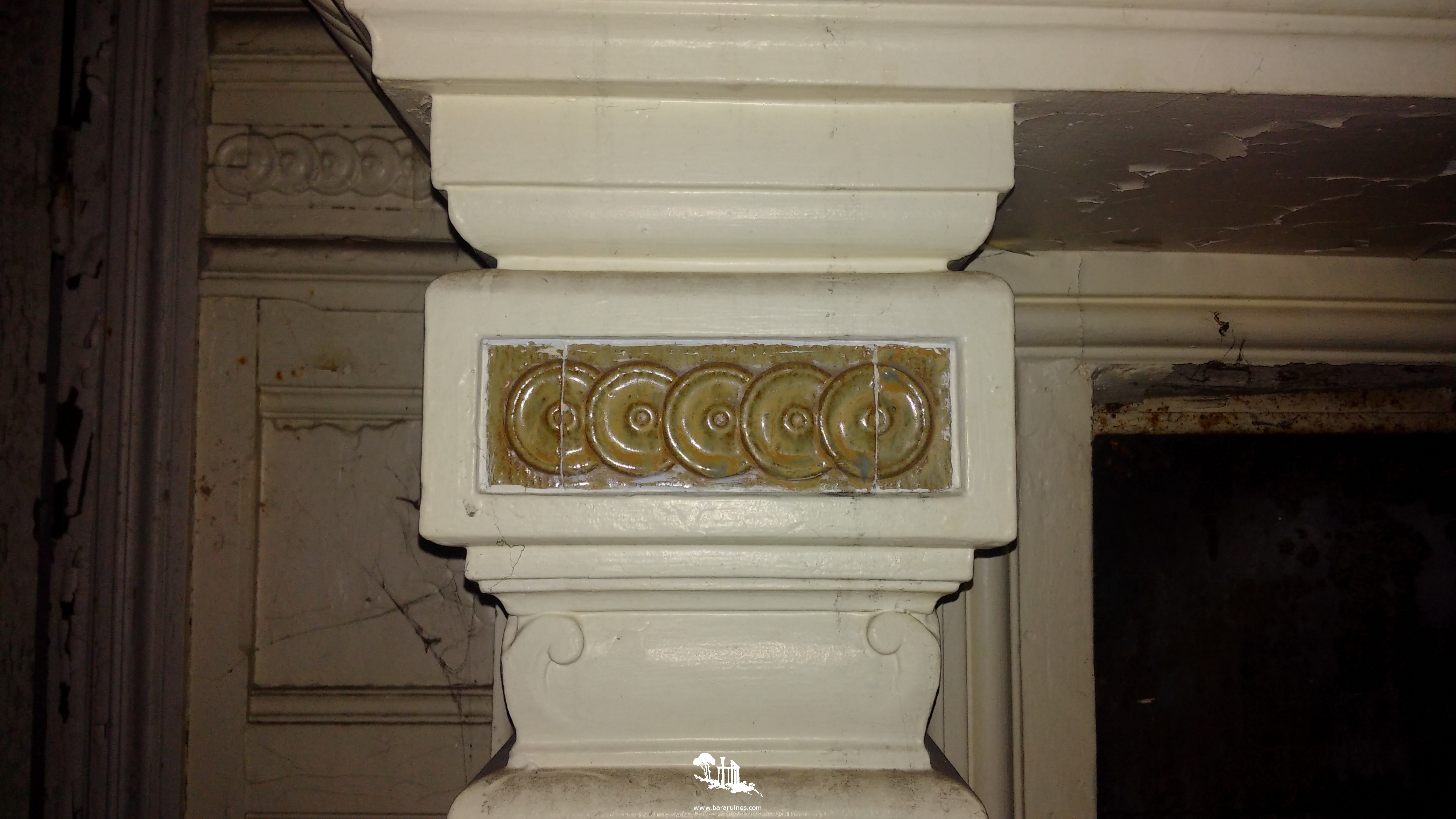 été brûlé au regard du sol carbonisé de cette section. Je redescends sur le palier du premier étage en constatant qu'il y a quand même de belles décorations murales, signe que le lieu a jadis été de bon goût. Direction le rez-de-chaussée. J'enfile donc ma lampe frontale, m'équipe de ma lampe torche, tout en ayant mon portable dans les mains pour prendre quelques photos. Vous m'excuserez donc de la qualité parfois floue de certains clichés, c'était plutôt galère que de s'en sortir comme cela et mon téléphone fait très mal les focus en intérieur. Ce niveau est bien plus haut de plafond que le reste du manoir. On arrive presque à y déceler une ancienne superbe ! Les murs sont en pierre de taille et sont ornés de petites céramiques très en vogues au début du siècle dernier. On peut