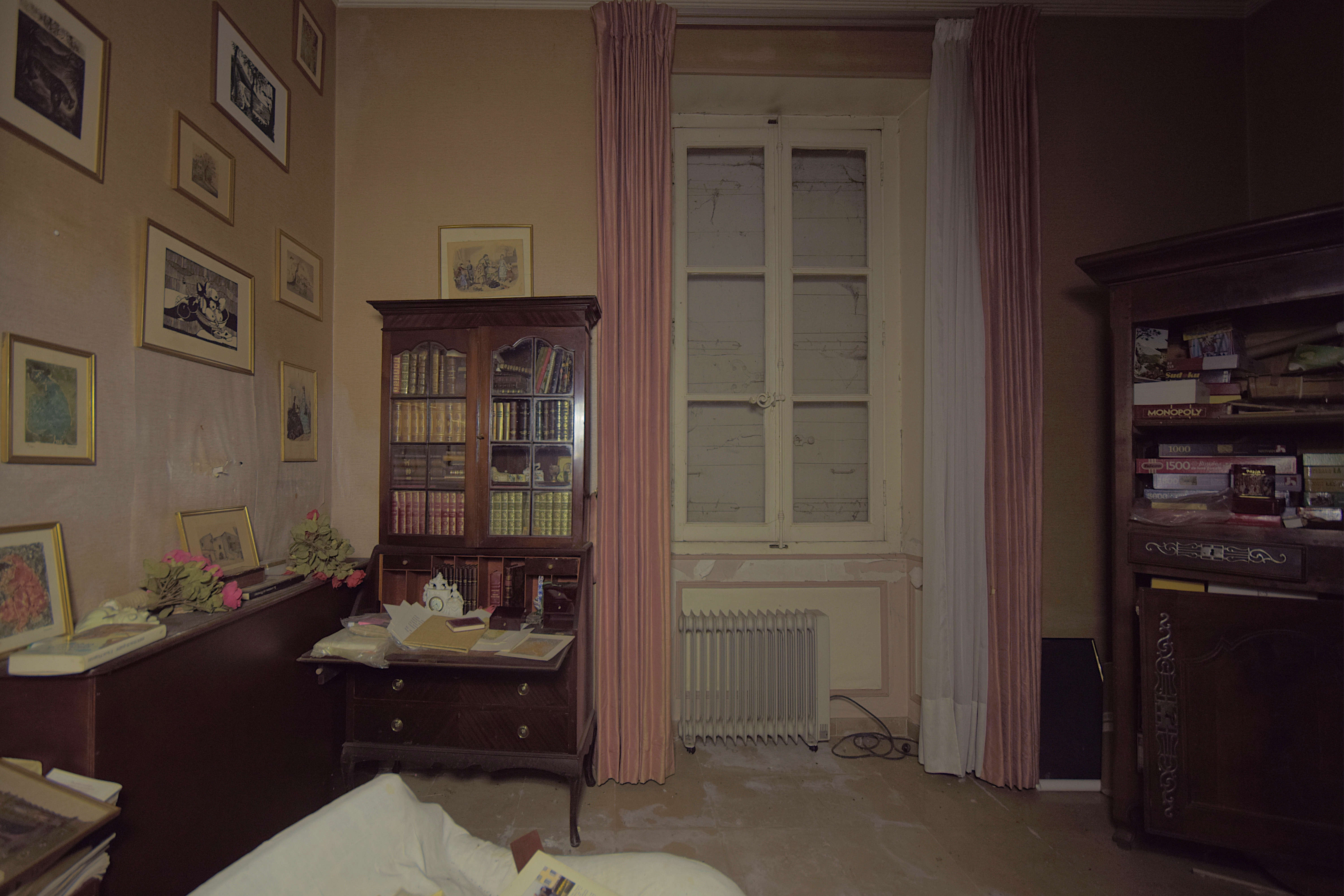 Les autres pièces sont restées dans leurs jus. Les volets étant fermés, il fait nuit noire. C'est un rien angoissant et même s'il fait chaud dehors, l'atmosphère est ici glaciale. En prenant des pauses longues, il faut donc que je fasse attention à ne pas respirer et éviter de capter la vapeur de mon souffle (quoique, les passionnés de Paranormal auraient pu y voir des apparitions fantomatiques). Le lieu est