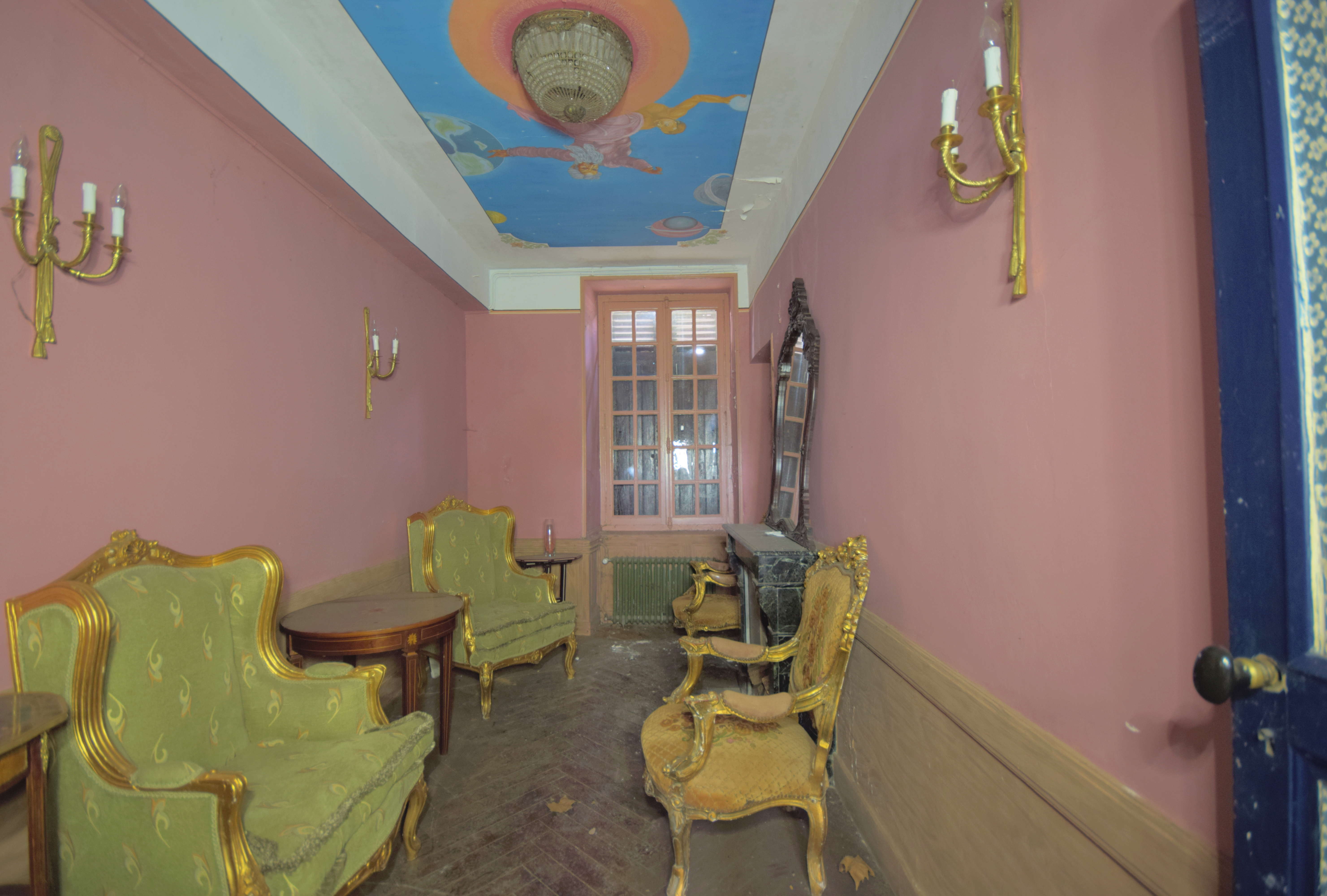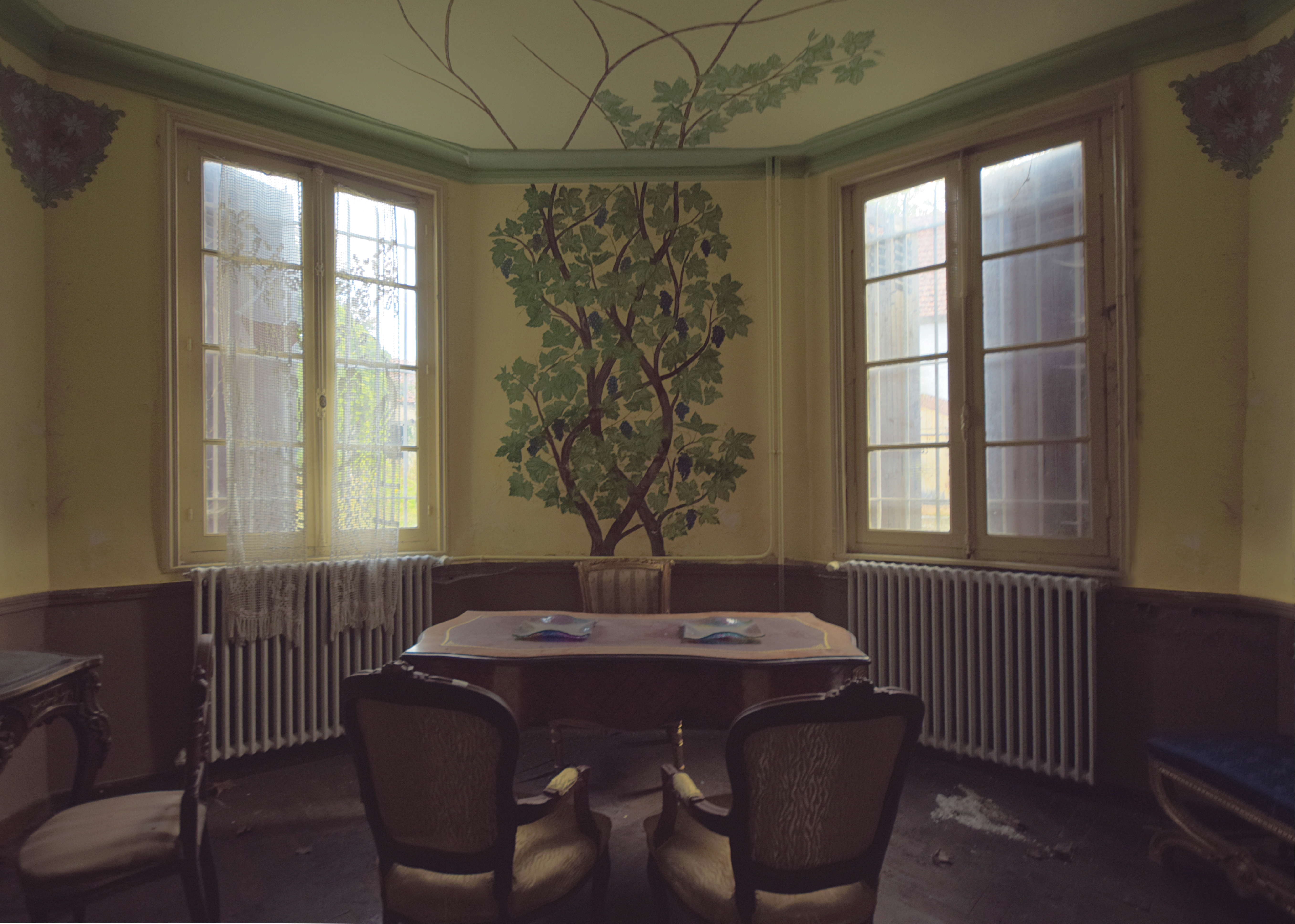 Le propriétaire a déserté le pays depuis plusieurs années et ne donne plus aucun signe de vie, de même, personne ne passe entretenir ce bien qui tombe progressivement en décrépitude. Mais c'est assez troublant de se promener dans un lieu aussi bien conservé qui semble presque comme neuf alors même qu'il est délaissé depuis plusieurs années déjà. Ce faisant, il n'y aura pas vraiment d'anecdotes à raconter. C'est juste bien beau pour les yeux. Nous commençons la visite au levé du soleil. Le salon,